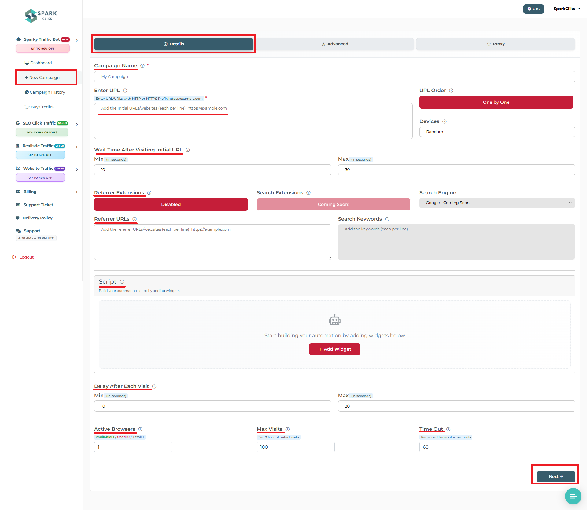 Learn how to create your first Sparky Traffic Bot campaign for free. Step-by-step setup guide to boost your website traffic and optimize your results today!