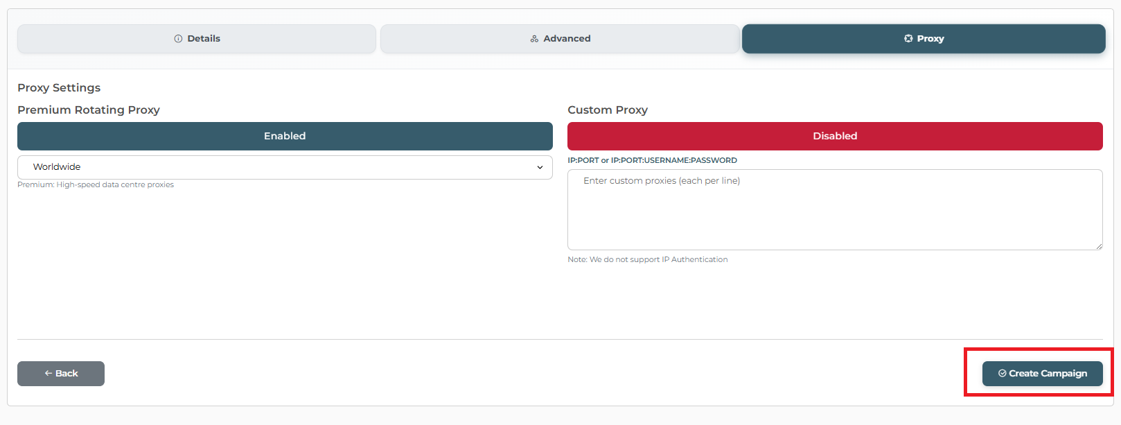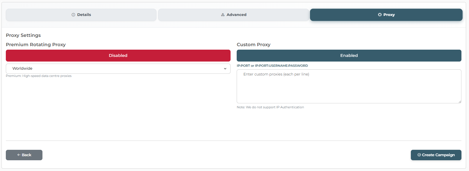 Next, navigate to the Proxy section to configure either Premium Proxy or Custom Proxy options.